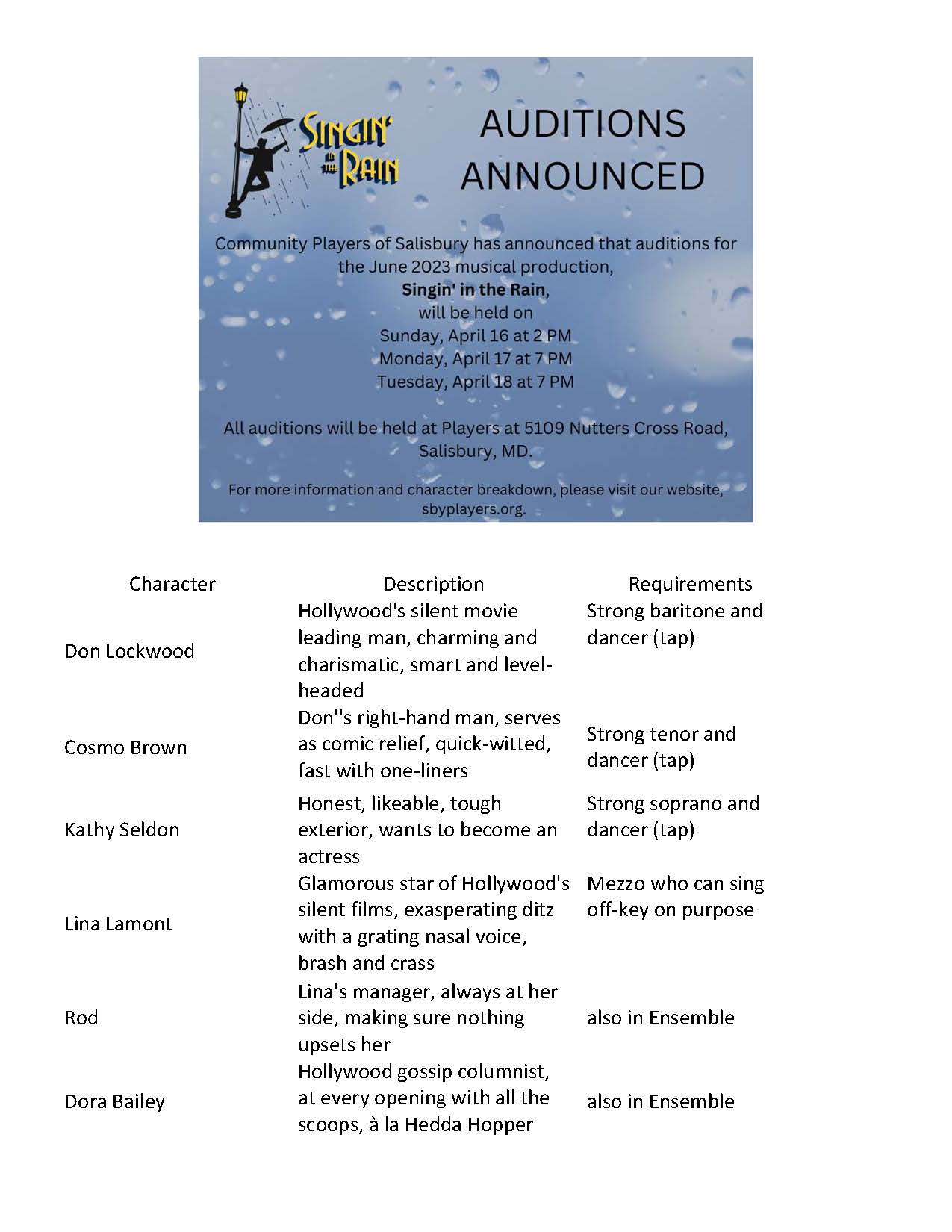| Community Players is committed to celebrating an inclusive culture of creativity by welcoming actors, technicians, designers, musicians, and production team members from varied backgrounds with regards to race, ethnicity, national origin, age, gender identity, sexual orientation, marital status, physical & mental ability, and religious & political beliefs. | ||