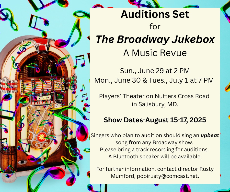 | Auditions for The Broadway Jukebox, A Music Revue were extended to include Thursday, July 3 at 7 PM at Players' Theater on Nutters Cross Road in Salisbury. Singers who plan to audition should sing an upbeat song from any Broadway show. Please bring a track recording for auditions. A Bluetooth speaker will be available. For further information, contact director Rusty Mumford, popirusty@comcast.net. |